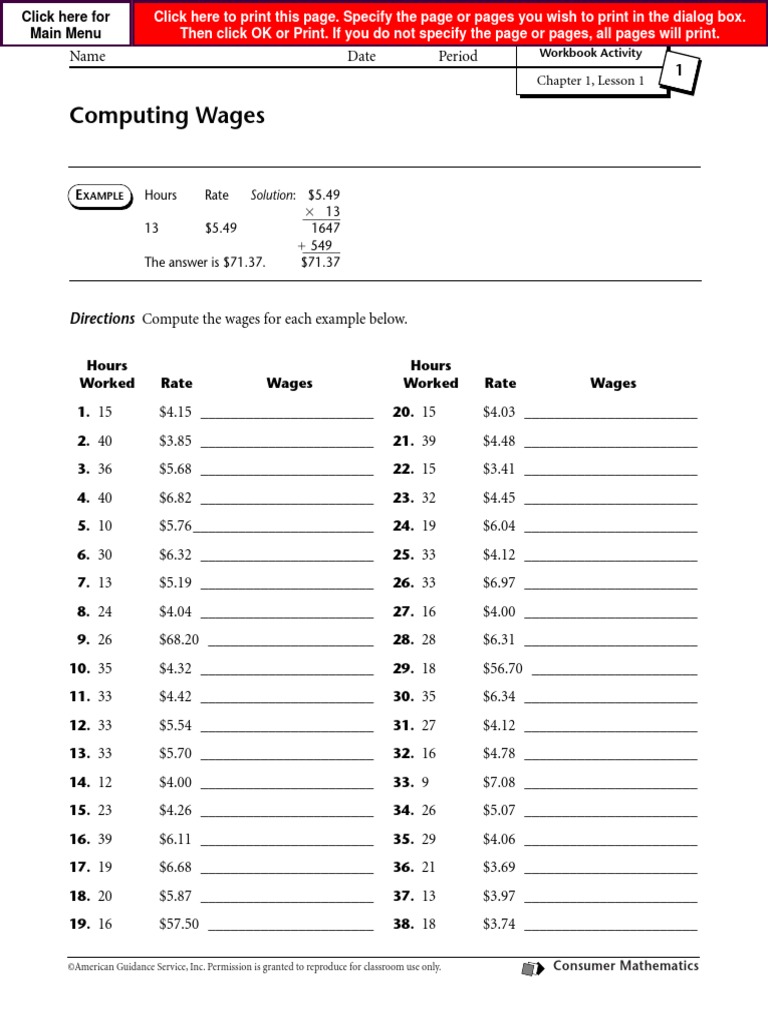 It is made up of 11 individual lessons as listed in the Table of Contents. Purchase of a simple basic math calculator is strongly recommended. Consumer Mathematics Name Date PeriodWorkbook Activity Chapter 1 Lesson 2 2 Estimating Annual Wages Hourly Estimated hours Solution.