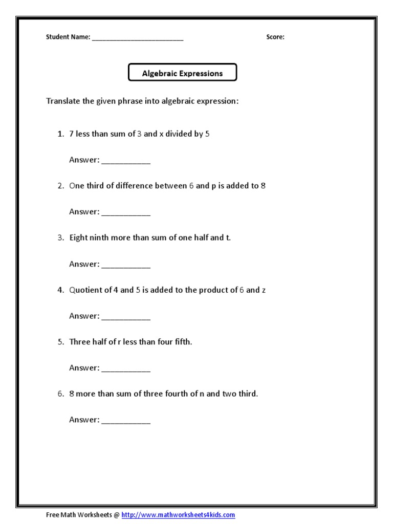 Each expression in this set of pdf translating phrases into algebraic expressions worksheets is of the form.